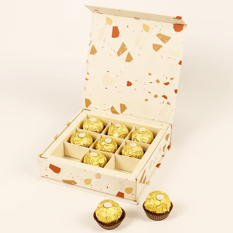 Our high end chocolate box packaging is carefully crafted from sturdy paper material. Advanced embossing and printing techniques are used in the production process to give the surface a laser effect that exudes elegance.Customized Logo Luxury Chocolate Gift Box Packaging Sweet Boxes Custom Chocolate Boxes
